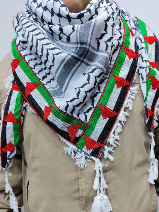original Palestinian keffiyeh, adorned with the vibrant colors of the Palestinian flag